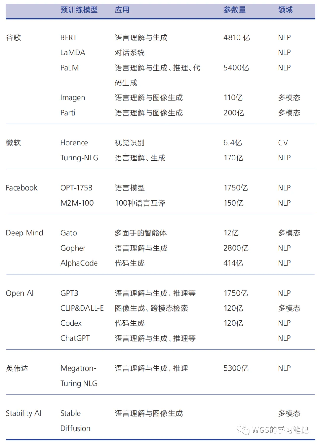 NLP预训练模型,如谷歌的 LaMDA 和 PaLM、Open AI的GPT系列; CV预训练模型,如微软的 Florence; 多模态预训练模型,即融合文字、图片、音视频等多种内容形式。