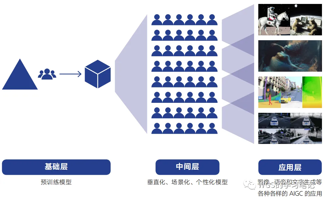 《报告》中说:目前,AIGC 产业生态体系的雏形已现,呈现为上中下三层架构: