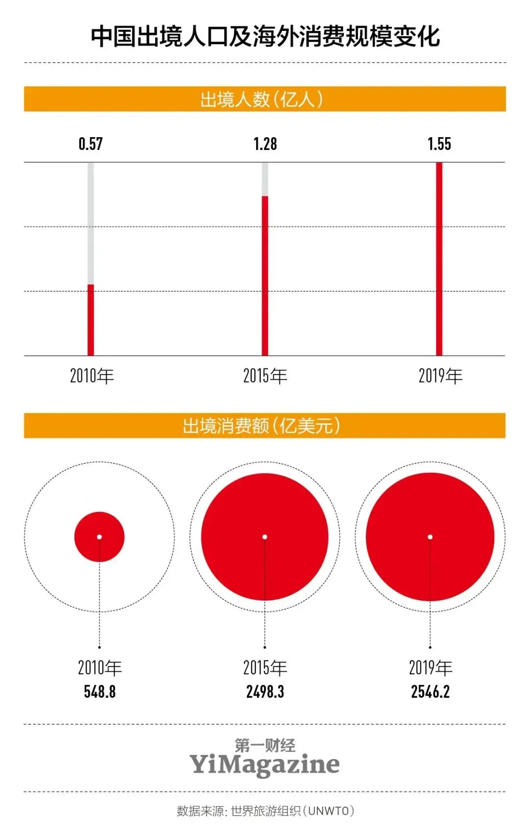 根据世界旅游组织(UNWTO)的数据,2015年,中国出境人数达到1.28亿人——约有1/10的中国人在这一年跨出了国门。2019年,这个数字增长到了1.55亿。不到10年之前的2010年,中国全年的出境人数还只有5700万人。