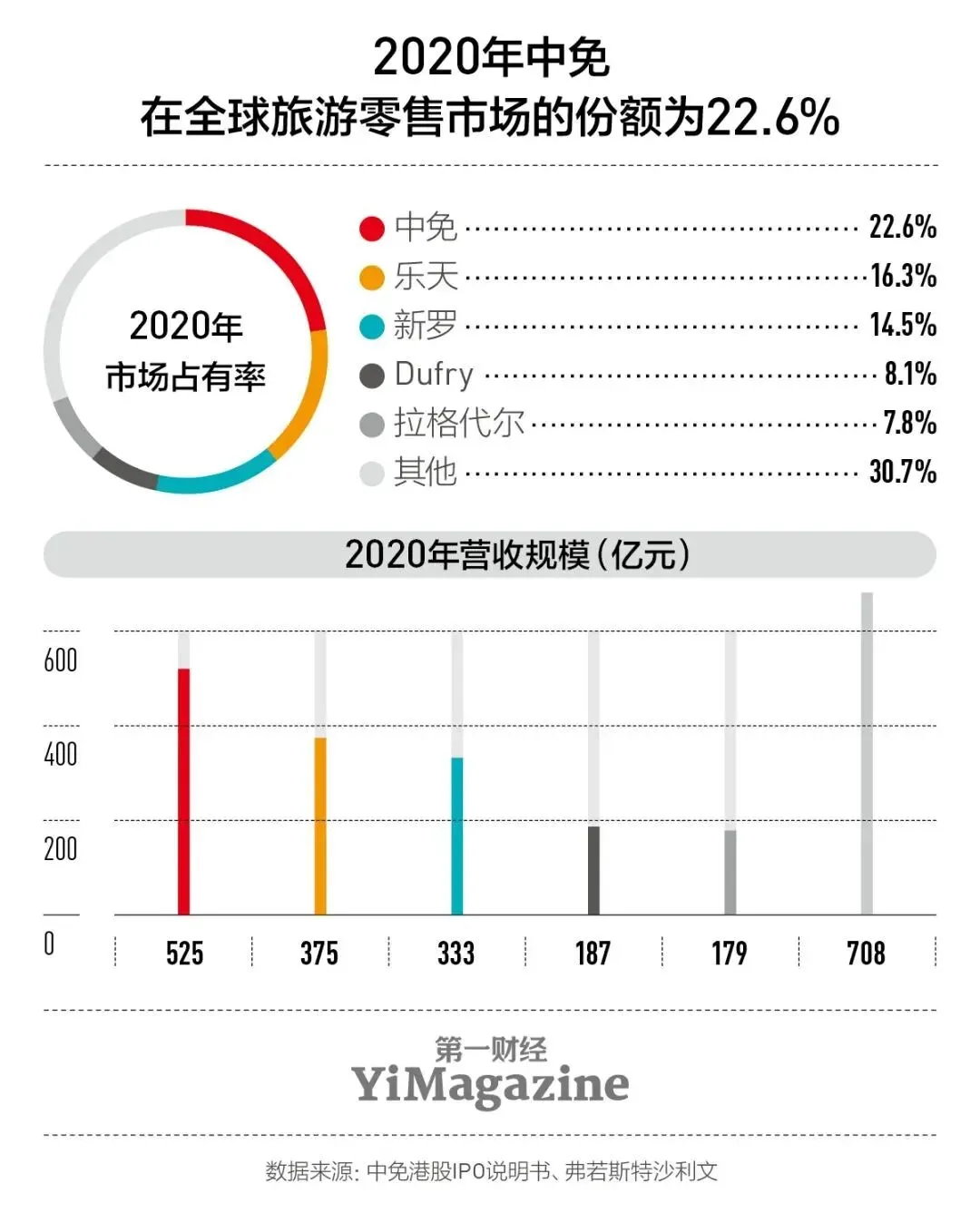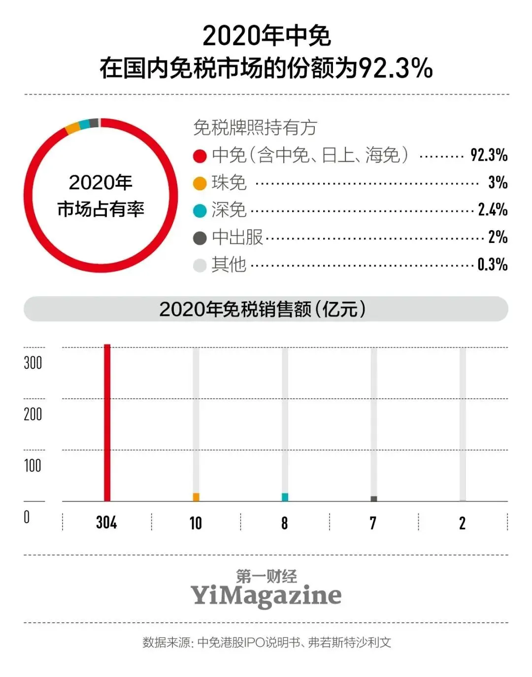 上述3笔收购让中免直接实现在国内免税市场一家独大的局面。沙利文报告显示,2015年中免在国内免税市场的份额为35%,两个日上的整体份额为43%。而根据中免2021年6月向港交所递交的二次上市招股书中引用的弗若斯特沙利文报告的信息,2020年它在国内的市场占有率高达92.3%。