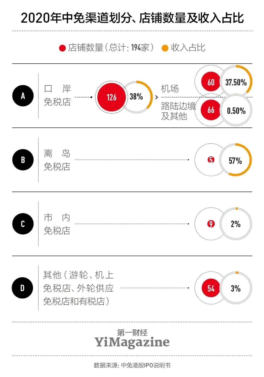 据中免港股IPO说明书提供的数据,截至2020年年底,其零售网络中有194个店铺,其中口岸免税店126个(包括60个机场门店和66个陆路边境门店)、离岛免税店5个、市内免税店9个、其他店铺54个。经由一系列收购,中免已经拿下了中国国内的主要出境机场,其中包括首都国际机场(T2+T3)、大兴机场、上海浦东和虹桥两大机场、广州白云机场,以及香港和澳门的国际机场免税店的经营权。