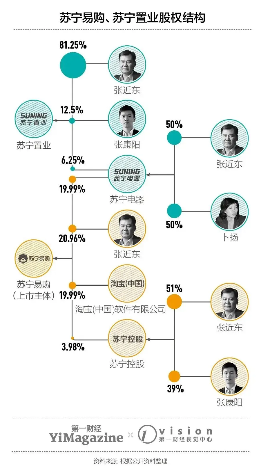 苏宁控股和苏宁置业都是张近东控股的非上市资产。公开资料显示,苏宁创始人张近东与其子张康阳分别持有苏宁控股51%和39%的股权。而淘宝(中国)与苏宁控股皆为苏宁的上市主体——苏宁易购(002024.SZ,以下或简称苏宁)的股东,分别持有该公司19.99%和3.98%的股权。