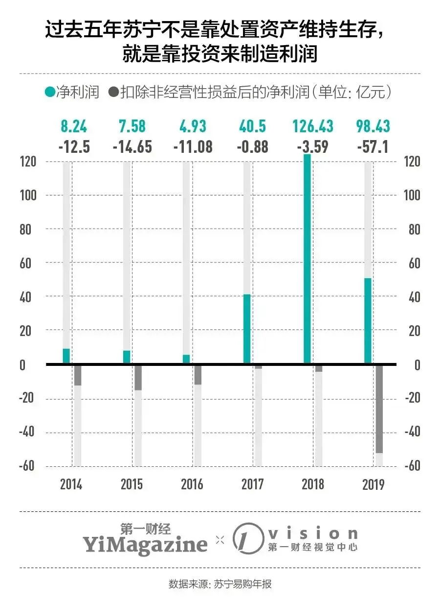 如果扣掉这部分收入,苏宁易购“归属上市公司股东的扣除非经常性损益后的净利润”实际录得3.59亿元的亏损。