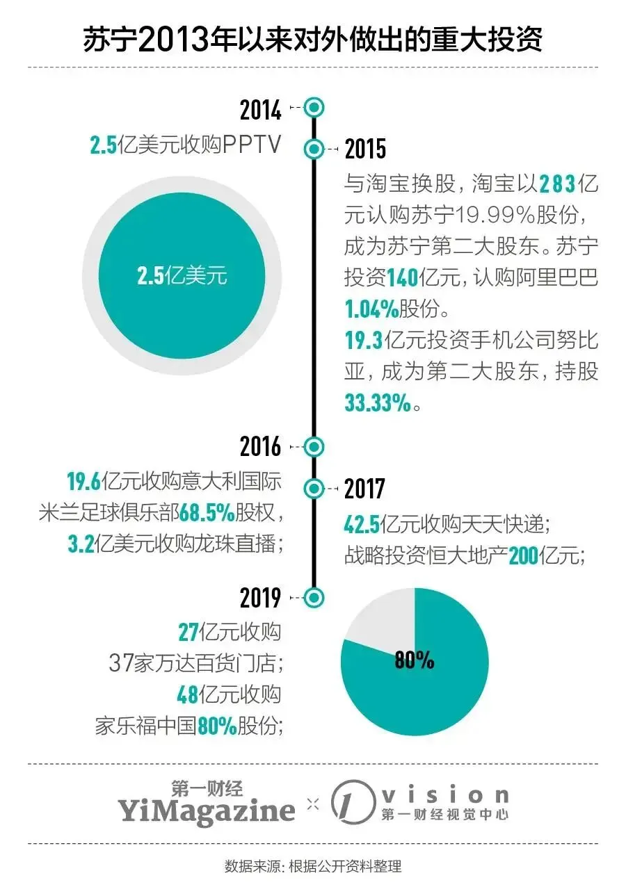 2018年年初,苏宁投入95亿元进入万达集团旗下的商业地产管理公司,获得3.91%的股份。4月收购超过300家位于上海的迪亚天天超市。2019年年初,它继续买下37家万达百货门店;6月则花了48亿元收购家乐福中国80%的股份。