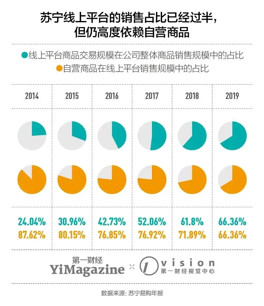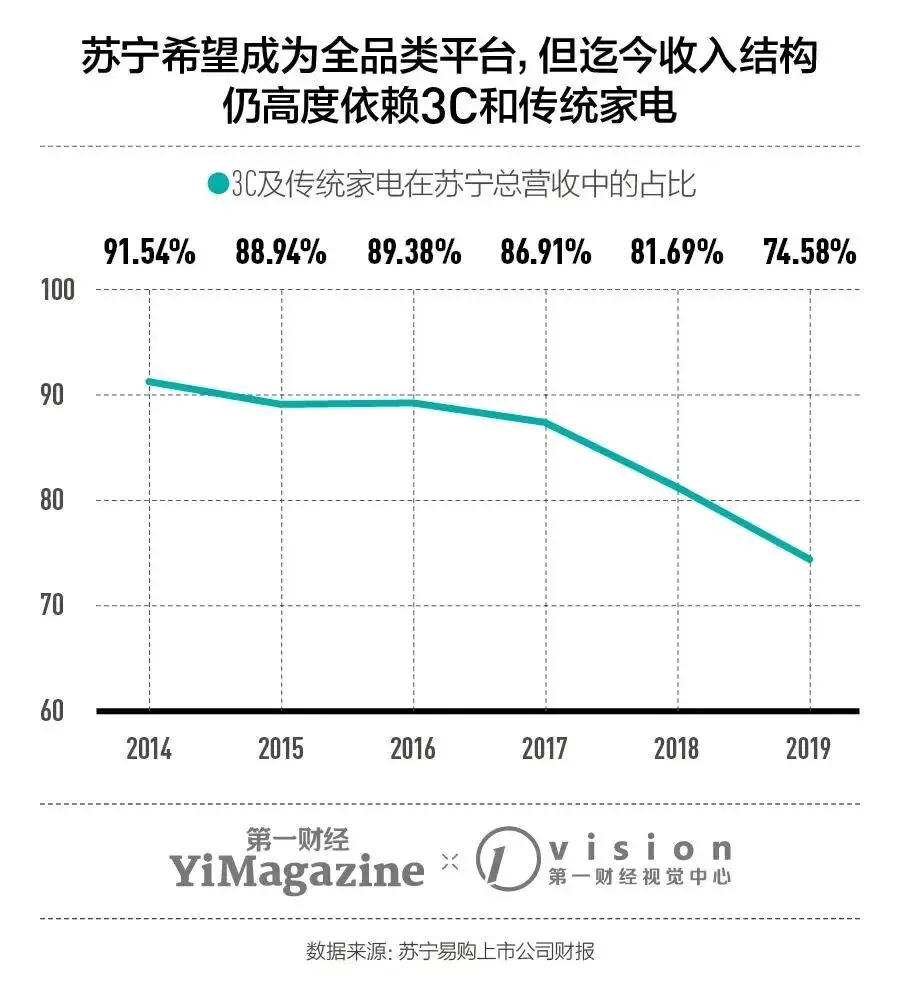 2014年起,苏宁开始在财务报表中统计美妆、家居零食、日用百货等新兴品类,不过由于占比过小,苏宁没有将这些品类的业绩贡献单列,而是合并计入小家电条目。2019年,3C和传统家电对公司总销售的贡献率仍然高达74.58%。