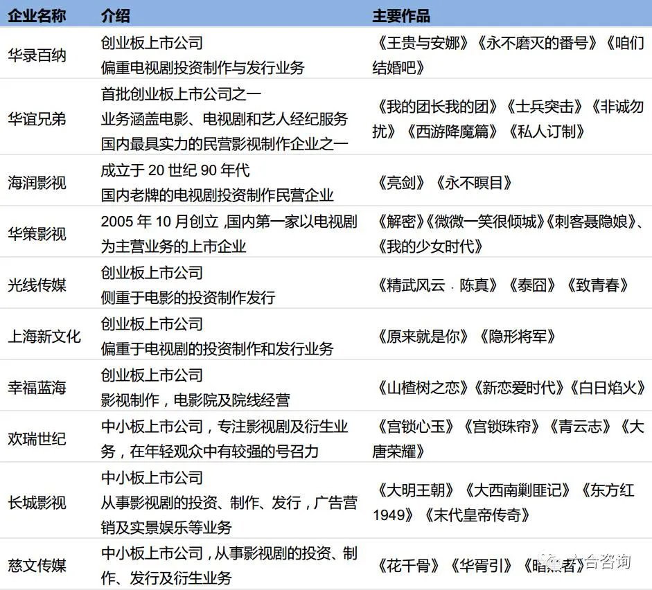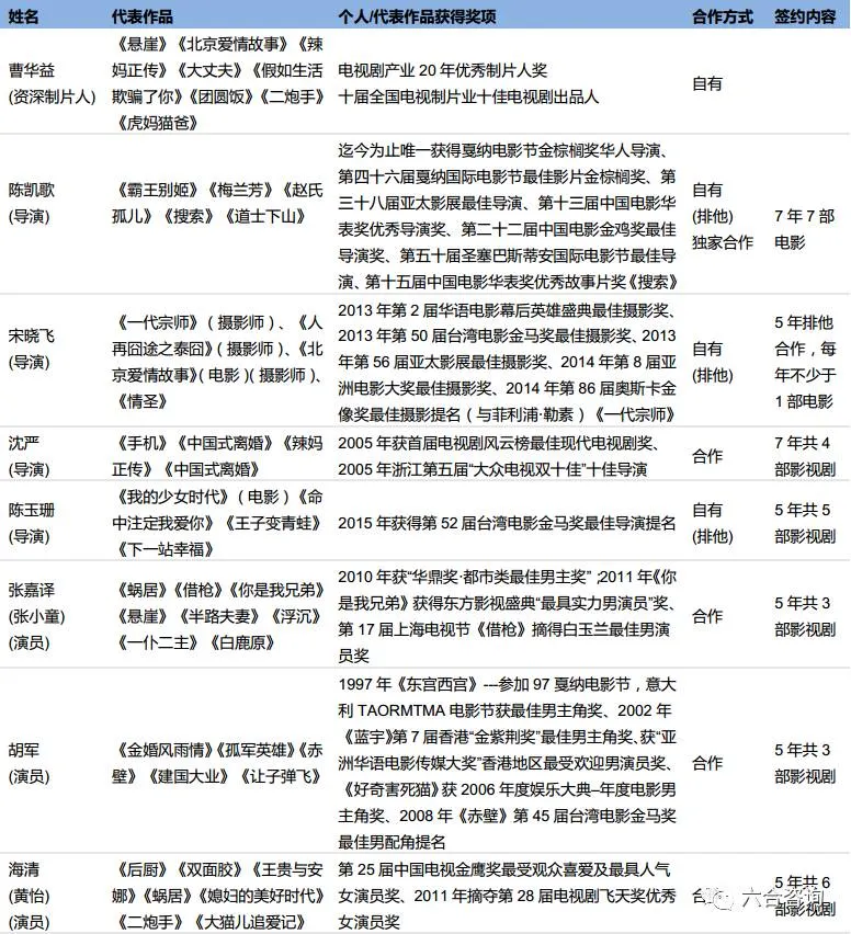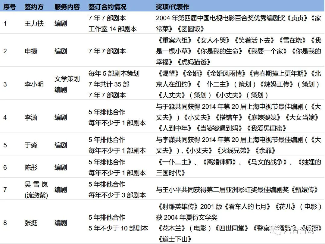 公司签约优秀编剧、导演,与知名制片人合作,形成优质影视剧运营平台。公司目前签约编剧13人,包括王力扶、吴雪岚(流潋紫)等知名编剧;签约资深制片人2位,分别为于正(余征)、陶昆;签约导演12位(陈凯歌、刘惠宁等),签约形式包含排他性合作。