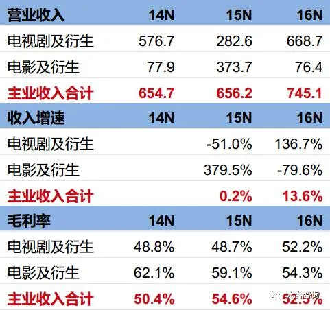 2014~2016年公司收入持续增长:2014年公司发行电视剧包括《一仆二主》、《父母爱情》、《二炮手》、《虎妈猫爸》、《大丈夫》,该5部电视剧取得收入占当期收入比例超75%;电影方面,公司制作并发行《我的早更女友》取得4亿票房,带来收入近0.8亿。2015年主打电影制作与出品。2016年公司发行电视剧《女医明妃传》、《小丈夫》、《剃刀边缘》、《风筝》,4部电视剧为公司创收占当期总收入81.9%;公司出品的精品电影《火锅英雄》、《情圣》+网络剧《余罪》取得口碑和市场双丰收,合计为公司创收1.03亿,占当期总收入13.3%。