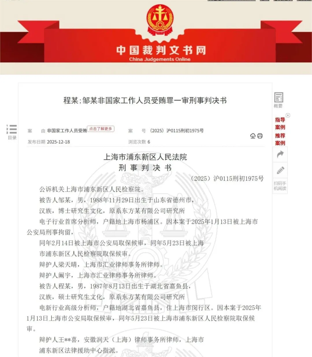 上海市浦东新区人民法院于2025年7月23日作出的刑事判决书显示,程某、邹某犯非国家工作人员受贿罪,一审分别被判处有期徒刑八个月和十个月,缓刑一年,分别处罚金十万元。