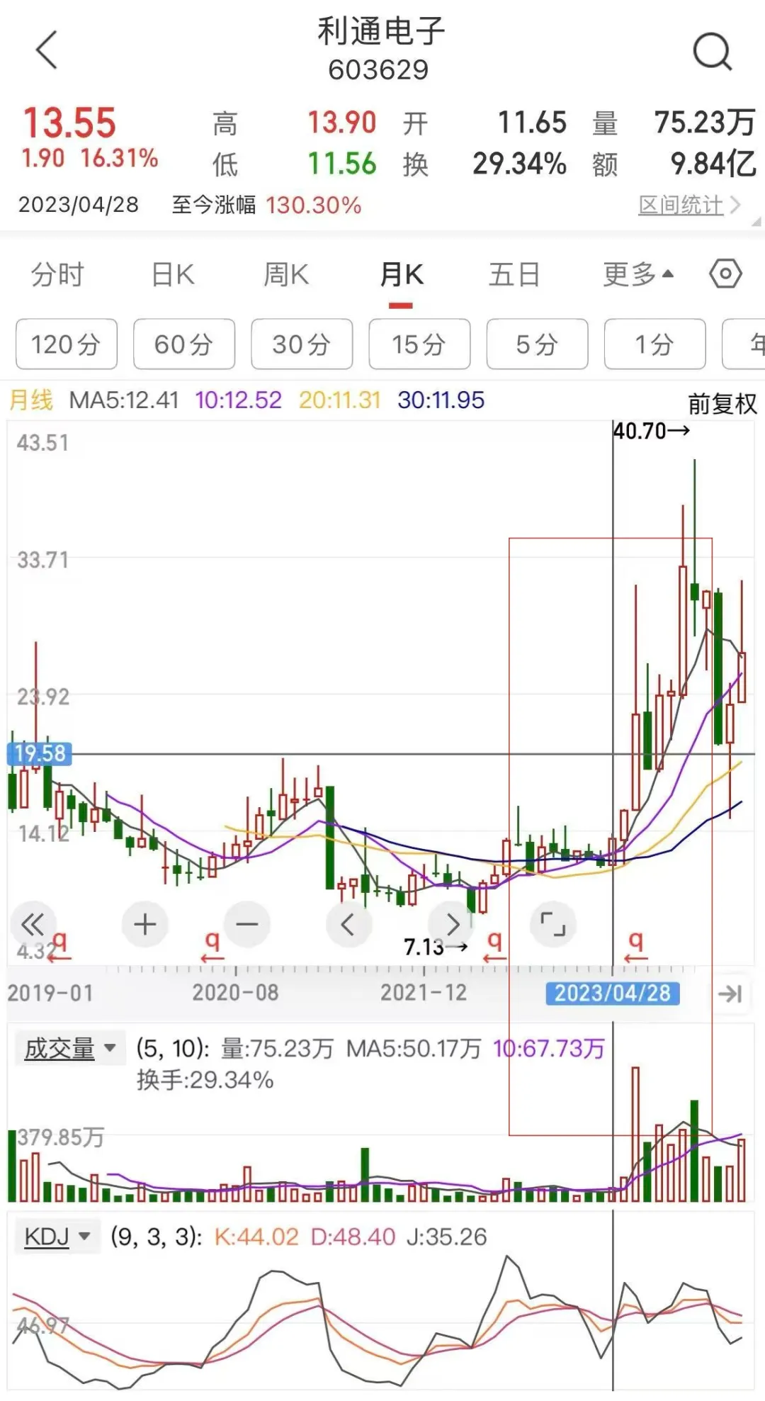 查询2023年4月份前后利通电子的股价,恰好处于低迷期。从当年二季度开始,利通电子股价持续上涨,到当年四季度最高曾走到过40.7元的高位。2025年12月24日的最新股价在26元多,公司总市值70亿元。