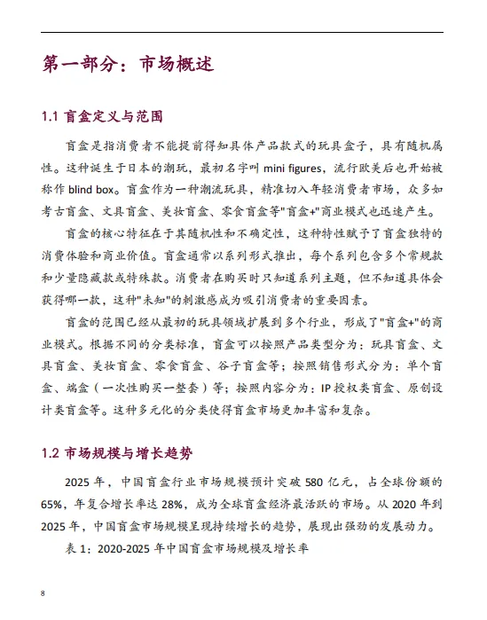 2025 年,中国盲盒行业已从 “小众潮玩” 发展为千亿级 “新消费基础设施”,市场规模突破 580 亿元,年复合增长率达 28%,占全球份额 65%,成为全球盲盒经济最活跃的市场。该行业的蓬勃发展得益于 Z 世代消费力崛起与情感消费时代到来,其融合惊喜、收藏与社交属性的独特模式,深刻改变了年轻消费者的购物习惯与文化表达。