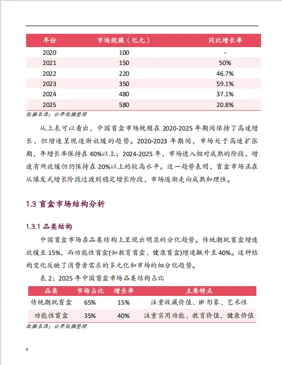 市场结构呈现显著变化:品类上,传统潮玩盲盒增速放缓至 15%,而教育、健康等功能性盲盒增速飙升至 40%;价格带向中高端升级,300-500 元轻奢盲盒占比达 35%,百元以下低端市场萎缩 12%,反映出消费升级趋势。