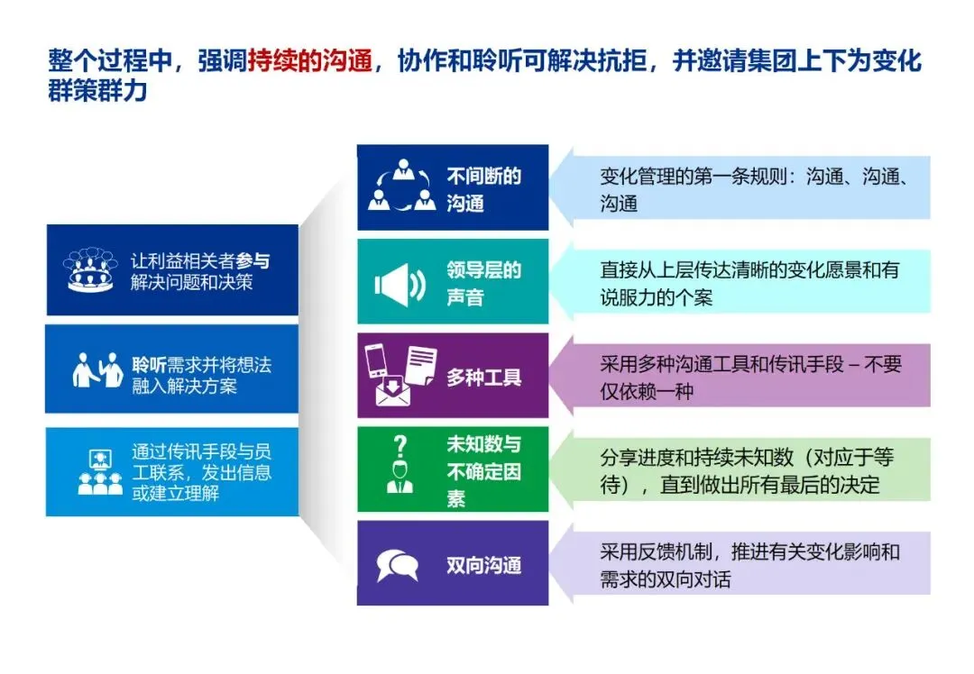 在调整策略时,要注意与各利益相关者的沟通。通过战略发布,投资者沟通,员工培训等方式,使公司上下在战略调整上达成一致,保证战略实施的一致性。