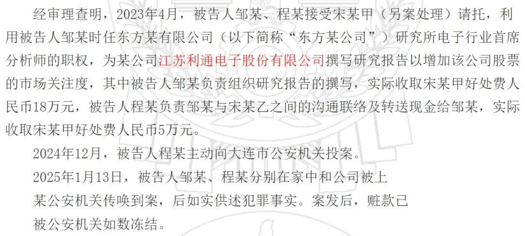 根据法院审理查明,2023年4月,被告人邹某、程某接受宋某甲(另案处理)请托,利用被告人邹某时任东方某有限公司(以下简称“东方某公司”)研究所电子行业首席分析师的职权,为某公司江苏利通电子股份有限公司撰写研究报告以增加该公司股票的市场关注度,其中被告人邹某负责组织研究报告的撰写,实际收取宋某甲好处费人民币18万元,被告人程某负责邹某与宋某乙之间的沟通联络及转送现金给邹某,实际收取宋某甲好处费人民币5万元。
