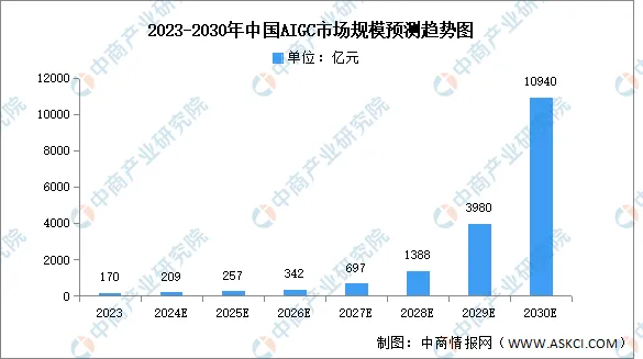 中国AIGC市场是全球AIGC市场的主要组成部分,中国AIGC市场受强大的市场需求及增强的AI技术所推动。中商产业研究院发布的《2023-2029全球与中国AIGC传媒市场现状及未来发展趋势》显示,2023年中国AIGC市场规模约为170亿元,中商产业研究院分析师预测,2030年AIGC市场规模将超万亿元。