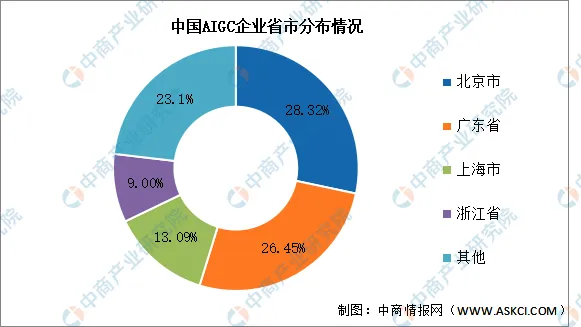 中国AIGC企业主要分布在北京市和广东省,其中,北京市占比最高,达28.32%。其次分别为广东省、上海市、浙江省,占比分别为26.45%、13.09%、9%。