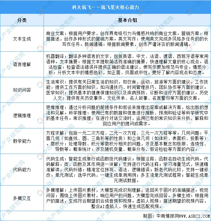 科大讯飞——讯飞星火认知大模型具有7大核心能力,即文本生成、语言理解、知识问答、逻辑推理、数学能力、代码能力、多模交互。具体如图所示: