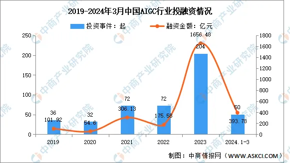 在政策推动与技术应用落地等多方位因素驱动下,我国AIGC行业正迎来新的风口。从2021年起,国内AIGC投融资市场投资热情高涨。2023年投资事件达204起,已披露融资金额达1656.48亿元,为历史新高。2024年第一季度,投资事件达50起,已披露融资金额达393.78亿元。