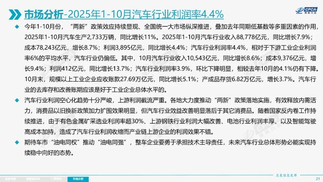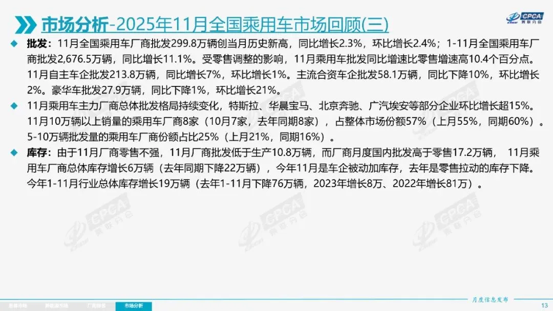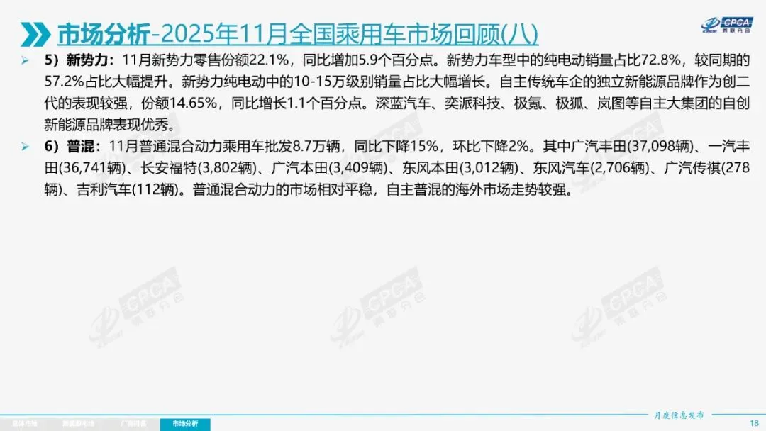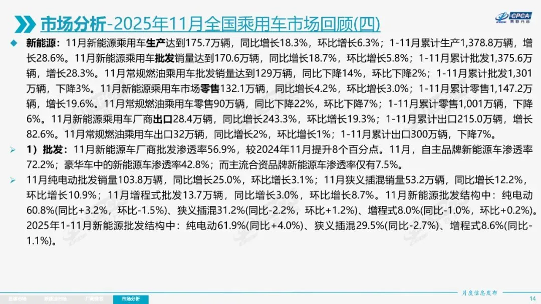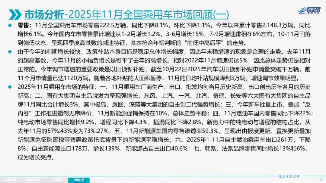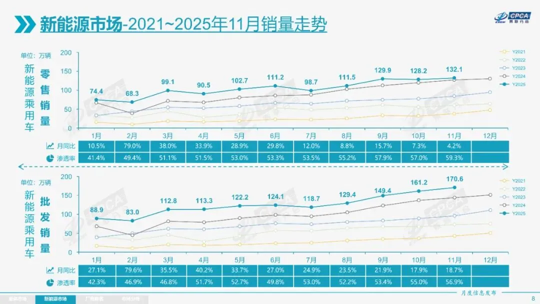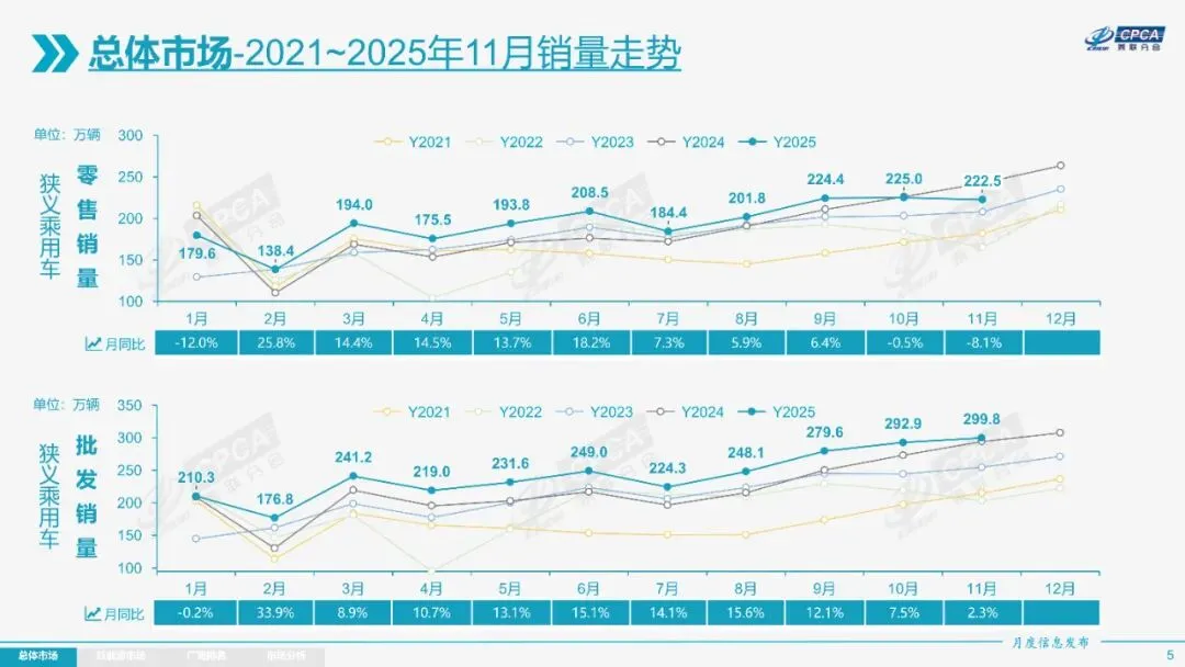 2025年11月全国乘用车市场分析报告显示,当月零售销量为222.5万辆,同比下降8.1%,环比下降1.1%;新能源乘用车零售132.1万辆,同比增长4.2%,环比增长3.0%。