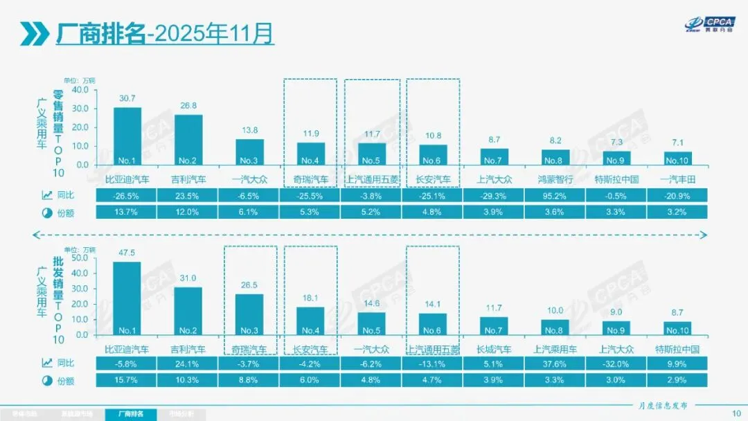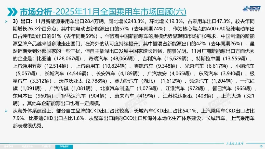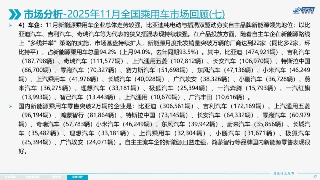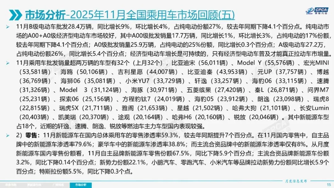 整体市场呈现“前低中高后平”走势,前期增长较快,年末增速放缓。新能源车国内零售渗透率达59.3%,出口占比47.3%,自主品牌在新能源和出口市场表现突出。厂商排名中,比亚迪汽车、吉利汽车等位居前列。