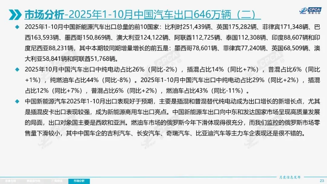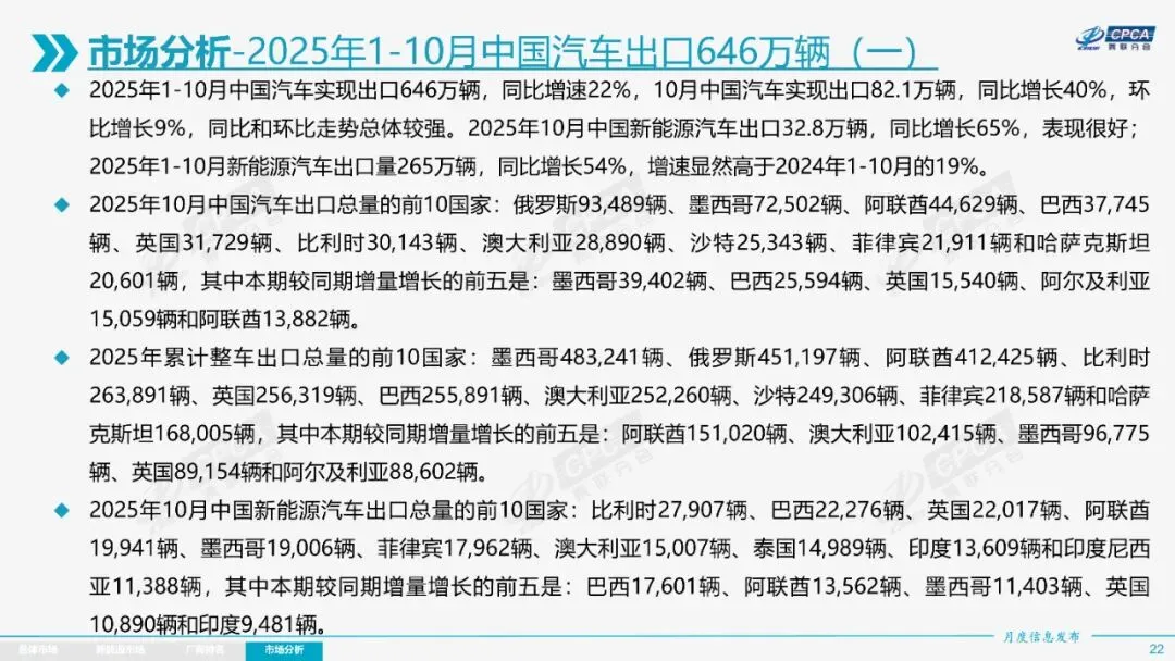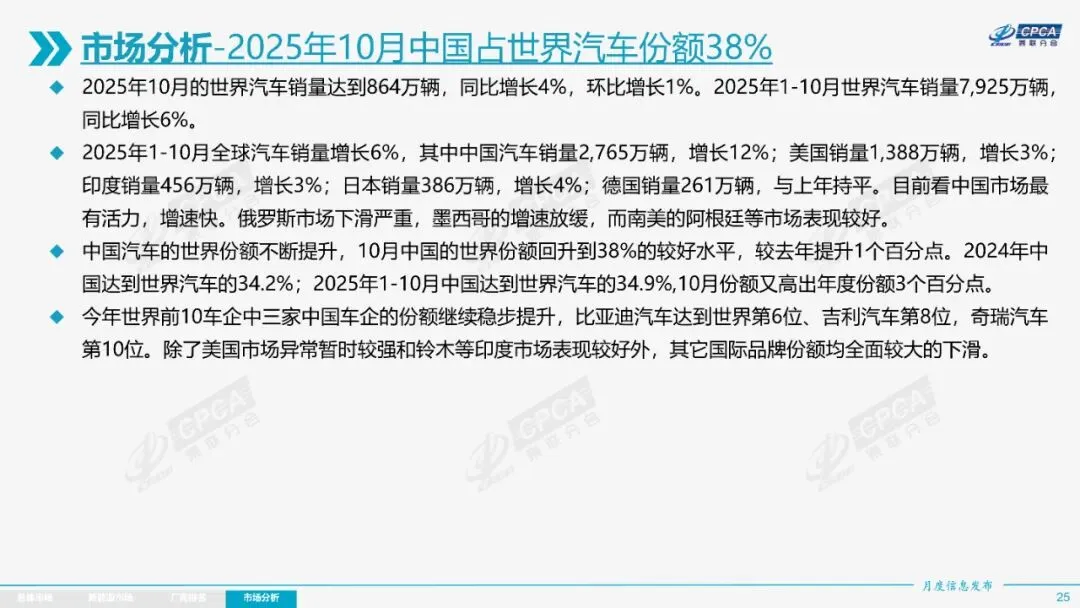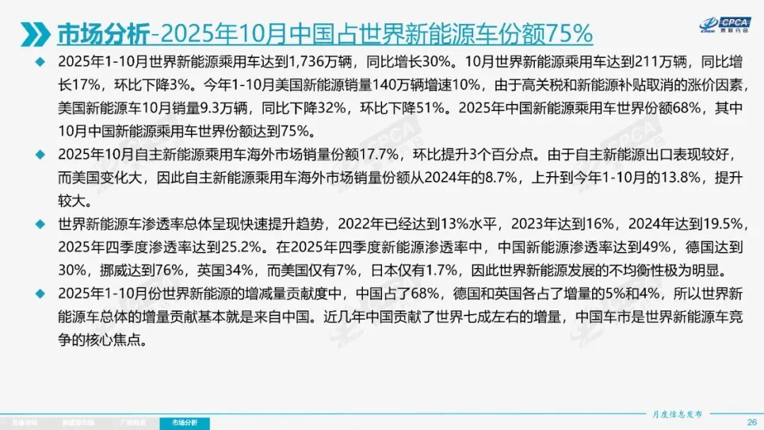 出口方面,11月乘用车出口60.1万辆,同比增长52.4%,新能源车出口增长迅猛。1-10月,中国汽车出口646万辆,新能源车出口265万辆,增速显著。中国市场占世界汽车份额38%,新能源车份额达75%,全球新能源车发展不均衡,中国是核心焦点。