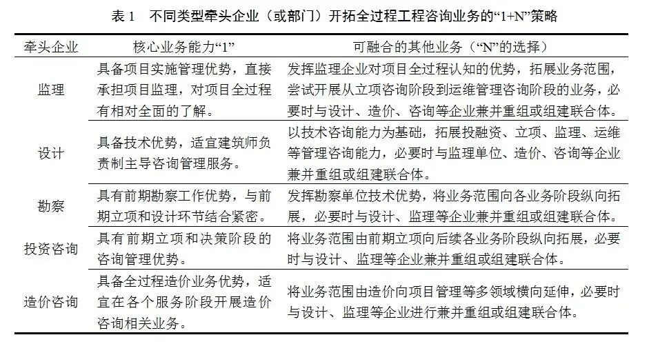 考虑不同类型企业(或部门)开展工程咨询服务的专业优势和突破重点,本文提出五类牵头企业(或部门)的“1+N”策略,如表1。