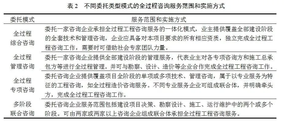 然而,所谓跨阶段或同一阶段咨询服务类型的内涵工作内容尚不清晰,不同咨询服务的委托方式和委托单位类型的形式也不尽明确,容易出现对项目全过程技术能力不足的企业承接全过程咨询业务的问题,从而背离了实施全过程工程咨询的初衷和预期。