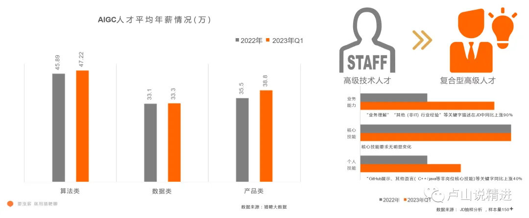 1、由高级技术人才升级到复合型高级人才是大势所趋。AIGC时代属于跨界复合型人才,那种既懂业务,又懂应用,也能跨界,还有品位和创造力的人;