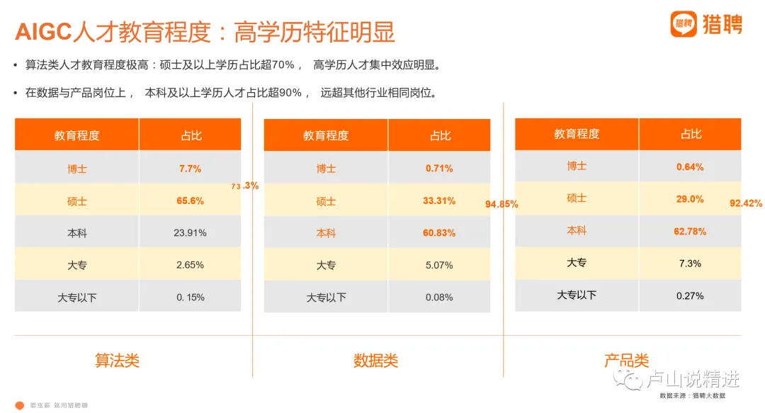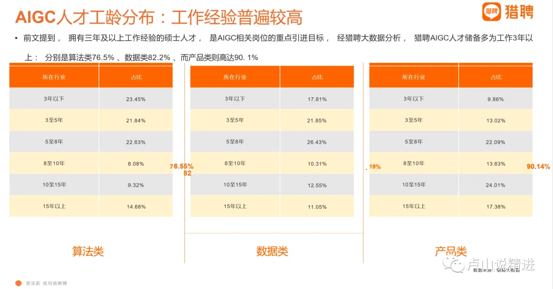 从工作年限上看,拥有三年及以上工作经验的硕士人才,是AIGC相关岗位的重点引进目标。经猎聘大数据分析,猎聘AIGC人才储备多为工作3年以上的, 按岗位来看,算法类76.5% 、数据类82.2% 、而产品类则高达90.1%。我最想知道的是:这能多多少少缓解一下中年危机问题吗?