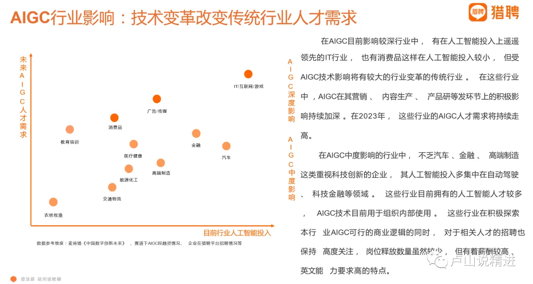 从AIGC对行业的影响上看,技术变革改变传统行业人才需求。行业受AI影响越大,对人才的需求就越强烈。