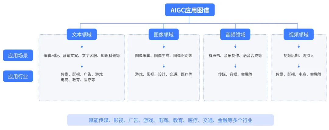 所谓AIGC,即AI Generated Content的缩写,指代人工智能生成内容。将带来新的内容生产方式,实现人工智能在文字、图像、⾳频、视频等多媒体领域的创作,在内容⽣产规模与生产效率方面达到指数级飞跃,极大提高内容生产力。早期AIGC工具已初步应用于传媒、电商等行业,随着技术创新加深,⾼性能AIGC产品将掀起全球信息产业生产力变革。