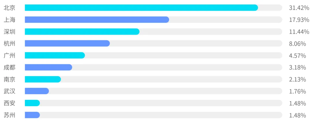 AIGC领域人才分布于多个新经济行业,其中纯互联网行业AIGC人才储备量最多。人工智能行业的AIGC人才保有量仅为6.45%,其他AIGC人才大多分布在数据密集型产业。AIGC人才多分布于⼀线、新⼀线城市,六成以上聚集在北京、上海、深圳三地。其中,北京独占三分之⼀,数量超过上海、深圳两城总和,人才吸引力遥遥领先。