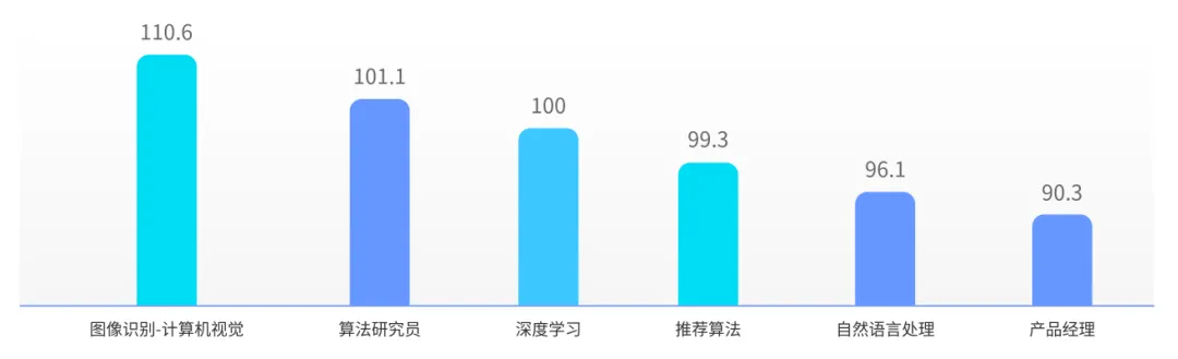 AIGC领域热招岗位中,图像识别、算法研究员、深度学习岗位的薪资均已达到百万。此外,AIGC产品经理作为非技术岗,薪资水平也达到90万元,与其他领域相比占据较大优势,吸引大量产品人才投递。
