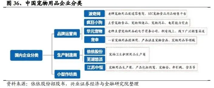 中国宠物用品行业市场高度分散,主要由三类市场参与者:1)宠物品牌运营商;2)具有较好研发、设计、生产能力的卫生用品生产商;3)规模比较小的作坊式的宠物用品生商。