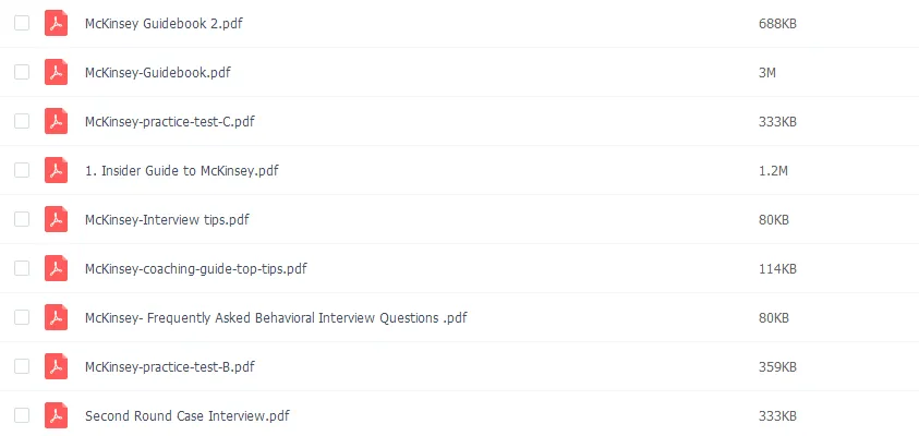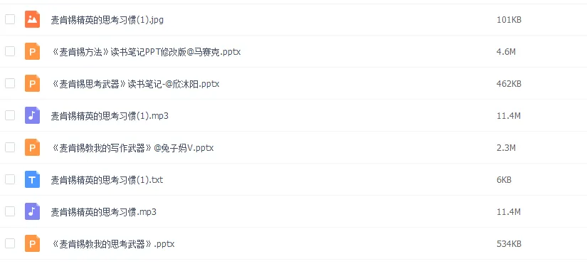 包括:麦肯锡工作方法(音频+笔记+PPT)、40份麦肯锡经典报告、100份各行业项目案例、麦肯锡经典书籍、面试指南、麦肯锡求职信样本和简历样本等