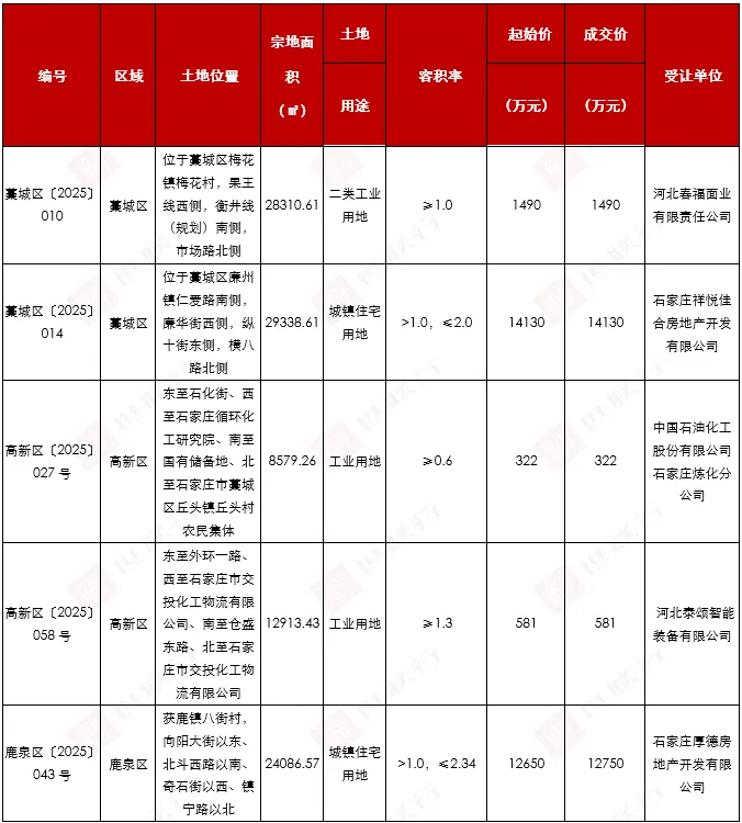 2025年第52周,共成交5宗土地,由高新区、鹿泉区、藁城区供应,为2宗住宅用地,3宗工业用地,总面积103228.48平方米,成交总价29273万元。土地详表如下: