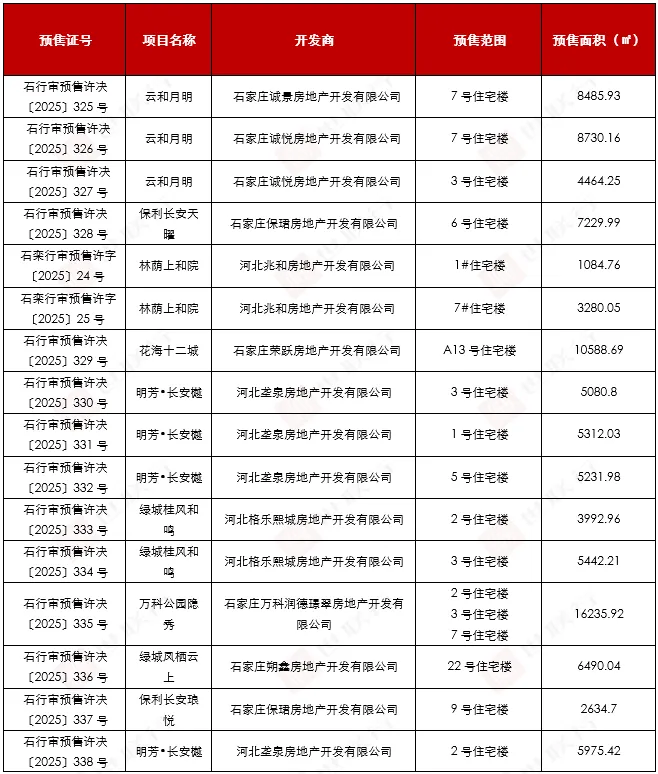 2025年第52周,石家庄新增预售许可证16个,由长安区、裕华区、桥西区、栾城区供应。