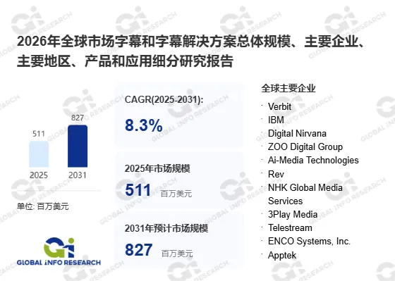 据调研数据显示,按收入计,2025年全球字幕和字幕解决方案字幕和字幕解决方案字幕和字幕解决方案收入大约511百万美元。(数据来源:《2026年全球市场字幕和字幕解决方案字幕和字幕解决方案方案总体规模、主要生产商、主要地区、产品和应用细分研究报告》 出版商:环洋市场咨询(Global Info Research))