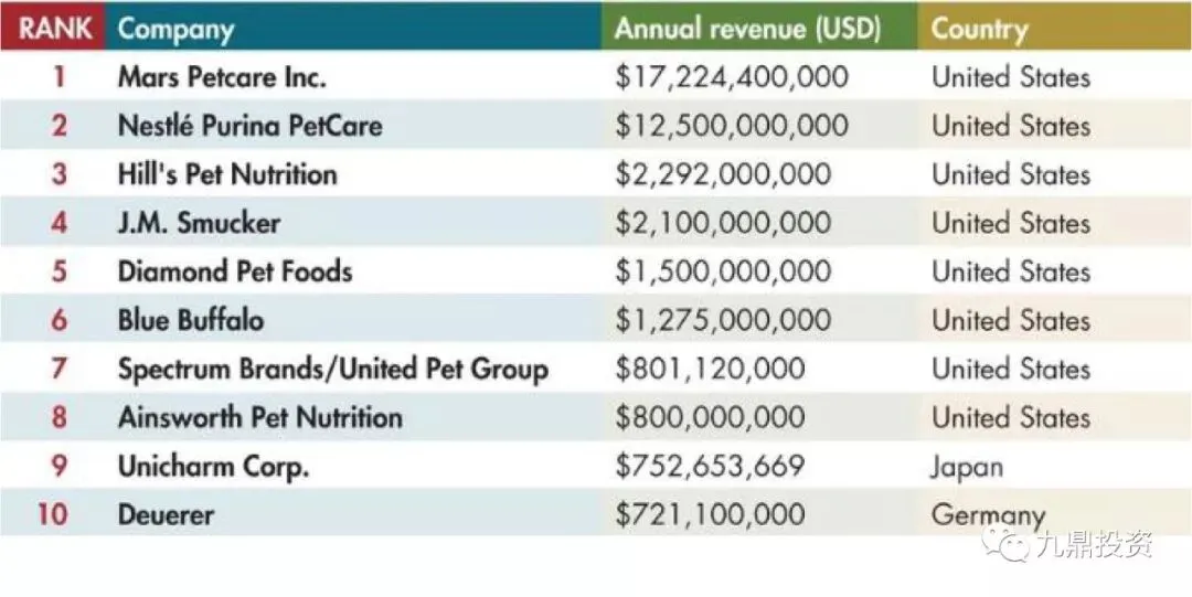 1935年,玛氏通过收购英国Chappel Brothers.,Ltd旗下的Chappie罐头狗粮进入宠物食品行业;1965年,普瑞纳通过收购Friskies进入宠物食品行业。随后二者展开了一系列并购。目前,玛氏旗下宠物业务拥有多达50个品牌,其业务已经在全球55个国家运营,拥有超过7万名员工。2017年宠物食品业务实现营收172.2亿美元,全球市场份额达22%;普瑞纳宠物食品拥有67个品牌,2017年营业收入高达125亿美元,美国市占率领先,全球市占率仅次于玛氏。