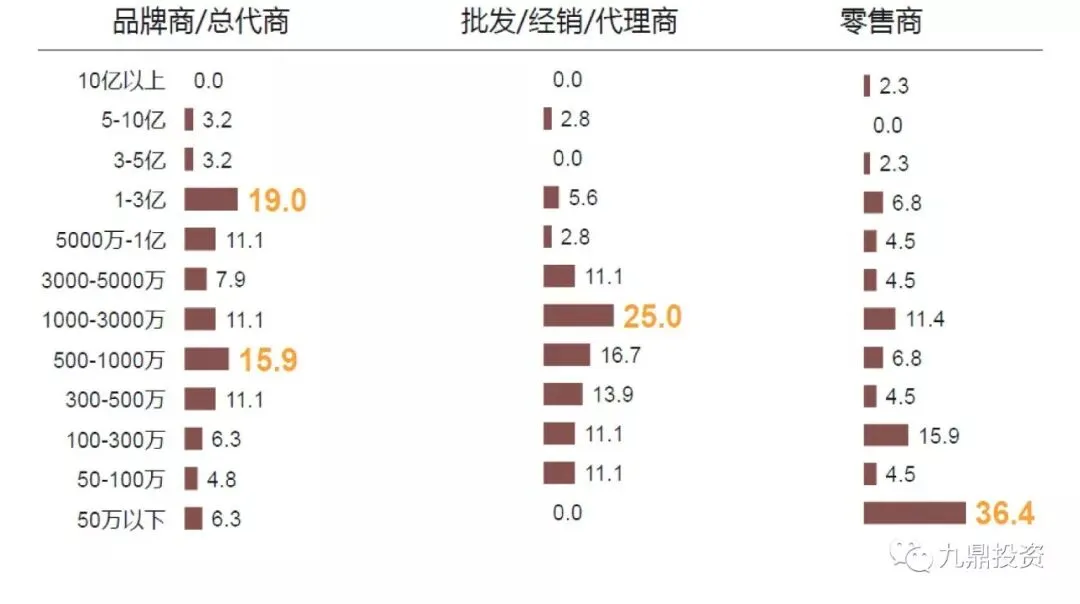 根据Petfair Asia和狗民网《2017年中国宠物行业白皮书》中对宠物行业企业销售额分布情况的调查数据显示,宠物行业品牌/总代商销售额主要集中在3亿以下区间,1~3亿销售额的企业最多,其次是销售额500~1000万的企业;批发/经销商年销售额主要集中在1000-3000万元;零售商年销售额主要在50万以下。
