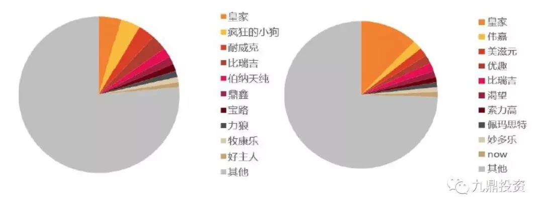 (2)玛氏、雀巢、皇家等国外宠物食品巨头进入中国20多年,占据了较大部分中高端市场,以及线下零售渠道。随着近些年养宠人群的壮大和电商购物的崛起,原来的饲料公司、新兴创业公司趁势而起,依靠互联网渠道,以及新兴营销手段,部分企业实现弯道超车。