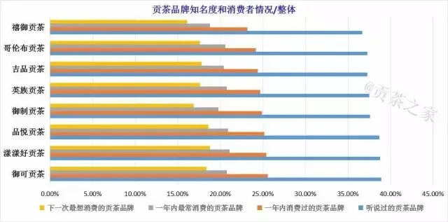 而来自贡茶之家2016.4.1至2016.4.7对华南区比较知名的8家贡茶品牌在网上征集了华南地区5000份调查样本: