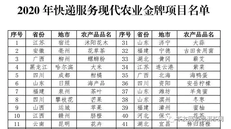 2020年12月31日,国家邮政局印发通知,公布60个“2020年快递服务现代农业金牌项目”。其中,安徽亳州花草茶、福建泉州茶叶、河北保定花茶、安徽六安茶叶、福建南平武夷岩茶、浙江丽水茶叶、安徽黄山茶叶七个项目业务量均超过千万件,分别位列第2名、第7名、第40名、第43名、第49名、第50名、第59名。