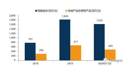 按产品分,现制茶饮占营收比例稳超70%。现制茶饮在2018年营收7.91亿元,在2019年同比增长130.59%至18.24亿元,略高于营业总收入130.17%的增速。现制茶饮占营收比从2018年的72.8%上升至2020Q1-Q3的77.2%,相应的,烘焙及其他产品占比则从27.2%降至22.8%。