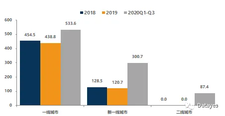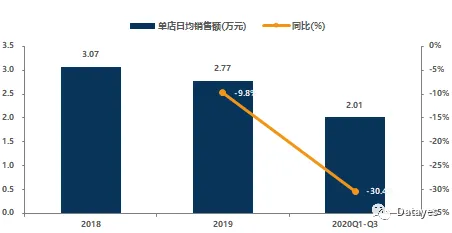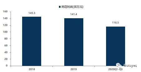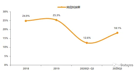 从同店来看,2019年奈雪的茶整体同店销售额为5.6亿元,同比下降4%,其中一线、新一线城市同店销售额分别为4.4亿元和1.2亿元,同比分别下降3.4%和6.1%,主要是门店加密对顾客有所分流。2020Q1-Q3同店销售额为9.2亿元,同比下降24.6%,其中一线、新一线和二线城市分别下降18.9%、27.7%和41.4%,主要是疫情影响所致。2020Q3同店销售额恢复到2019年同期的90.9%。