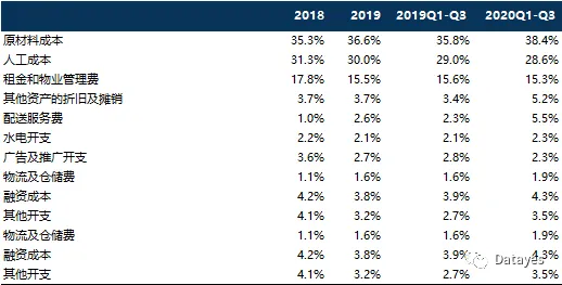 原材料和人工为奈雪的茶主要成本。2020Q1-Q3原材料和人工成本分别占营收比重的38.4%和28.6%,较2019年同期分别上升2.6个百分点和下降0.4个百分点。其中原材料成本占比上升主要源于原材料物价上涨,以及疫情导致订单减少,致原材料损耗增长;人工成本降低主要源于店员效率提升,以及数字化升级,致在线点单人数增长。公司公告披露,奈雪的茶将持续升级及数字化其供应链系统,以实现更准确的存货预测等措施,有效控制成本支出。