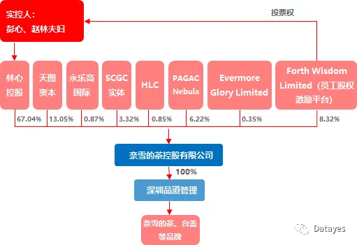 2021年2月,奈雪的茶正式向香港联交所提交招股文件。发行前,彭心、赵林夫妇通过各自持有林心控股50%的股份,间接持有公司67.04%的股份,同时员工股权激励平台8.32%股权对应的投票权由其控制,彭心、赵林夫妇为公司的实际控制人,实控人股权结构稳定,且员工股权平台较高的持股比例有利于核心员工的激励。