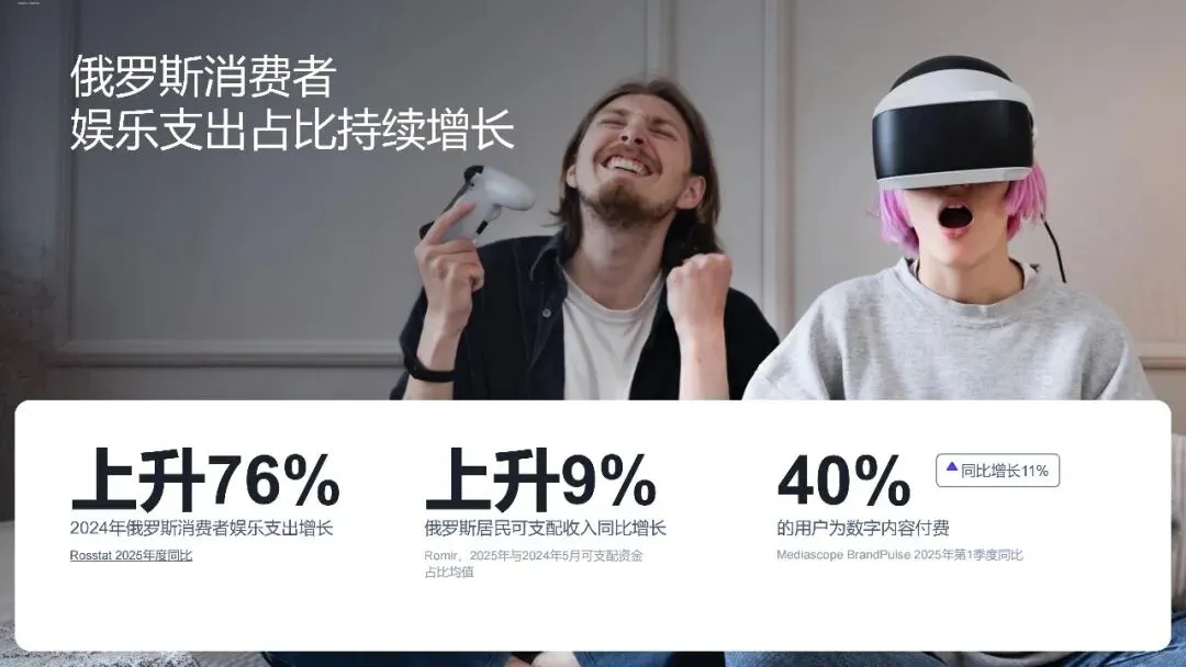 俄罗斯消费者的娱乐预算在过去一年显著上升。2024 年有 76% 的用户提高娱乐支出,而 2025 年 5 月的可支配收入也同比增长 9%。随着支付能力的增强,数字内容付费习惯快速成熟,40% 的用户愿意为数字内容付费,同比增长 11%,这为游戏行业带来稳定的商业基础。