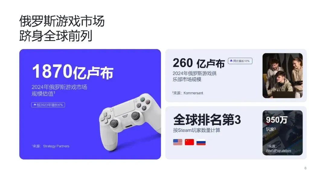 游戏市场本身也在持续扩张:2024 年俄罗斯视频游戏市场预计达到 1870 亿卢布,同比增长 6%,游戏俱乐部等线下场景的营收也达到 260 亿卢布。无论从消费意愿还是市场规模基础来看,俄罗斯已成为全球增长潜力显著的游戏市场之一。