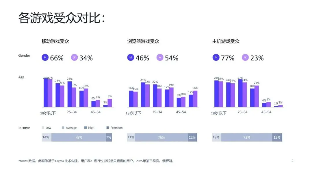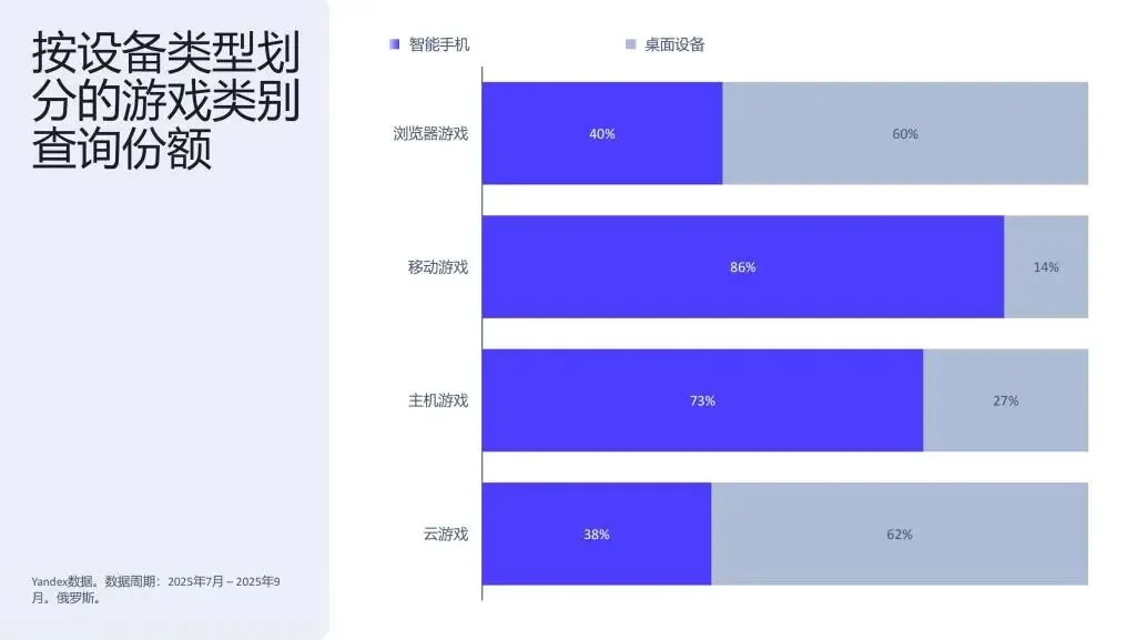 俄罗斯玩家的游戏方式正在从“单一设备”转向“多设备并行”。从搜索与信息获取阶段来看,不同游戏类型在设备端呈现出明显差异:移动游戏相关查询中,86% 来自智能手机;主机游戏中,73% 的查询同样来自移动端;而浏览器游戏与云游戏则更偏向桌面设备,台式机占比分别达到 60% 与 62%。