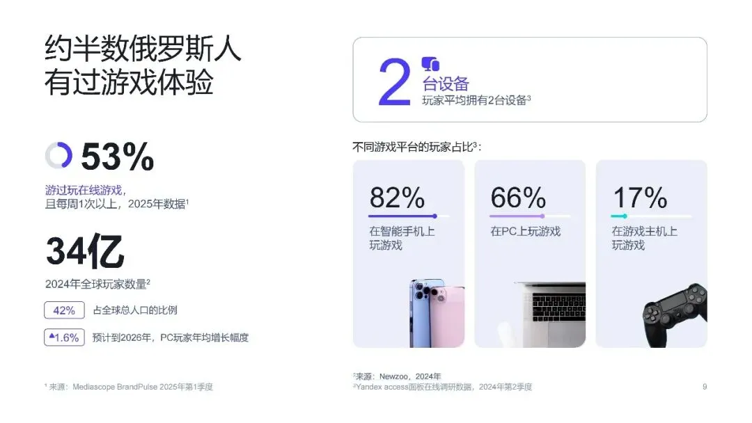 这意味着,游戏曝光与转化路径并非集中在单一终端,而是分散在多个使用场景之中。与此同时,53% 的俄罗斯人口平均使用 2 台设备,每周玩一次在线游戏,游戏已成为大众级娱乐方式,为跨平台触达提供了坚实的用户基础。